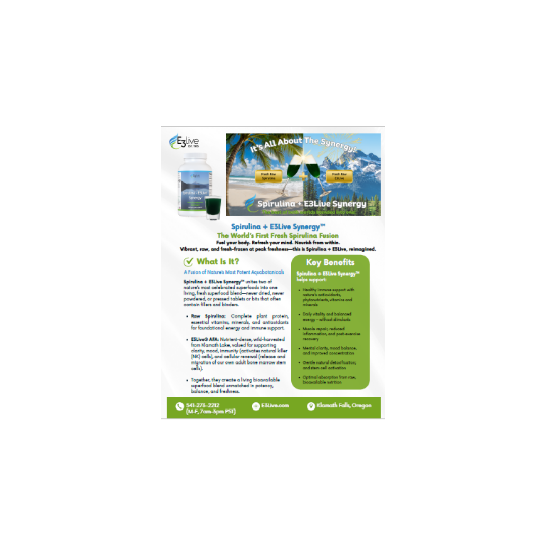 Learn more about Spirulina + E3Live Synergy with our downloadable/printable flyer.